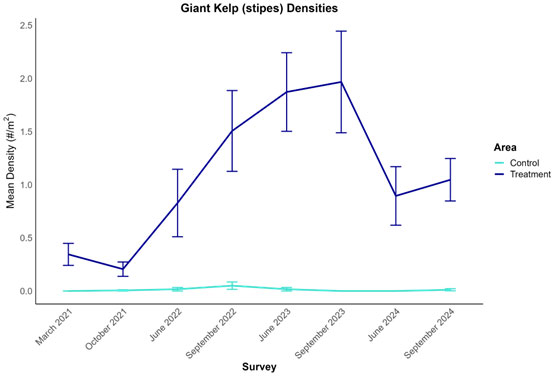 - Giant kelp densities have remained stable since the fall 2023 surveys.