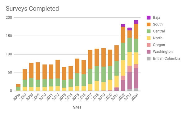 Reef Check’s Kelp Forest Monitoring Program continues to expand with 2024 being our biggest year yet! In 2024, we completed more than 190 surveys in California, Oregon, Washington, Baja California, and British Columbia. Since data collection began in 2006, Reef Check has conducted almost 1,900 surveys. All data is now available through our Data Request Form.
