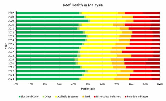 The data suggest that the health of Malaysia’s coral reefs is deteriorating. Other key findings from the surveys are: