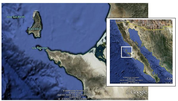 Baja Peninsula with close up Isla Natividad located at the western extent of Vizcaino Peninsula