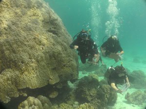 What the group lacked in experience they made up for in spirit and enthusiasm. Three days of EcoDiver training followed – these mornings were spent in the classroom learning survey methods and how to identify RC indicators for the Indo-Pacific, such as the Humphead Wrasse and the Triton Seasnail. Then the afternoons were spent learning how to lay a transect line and practicing survey methods for each of the three surveys – fish, invertebrates and substrate. Just learning the metric system was another challenge for Americans used to working in inches and feet!