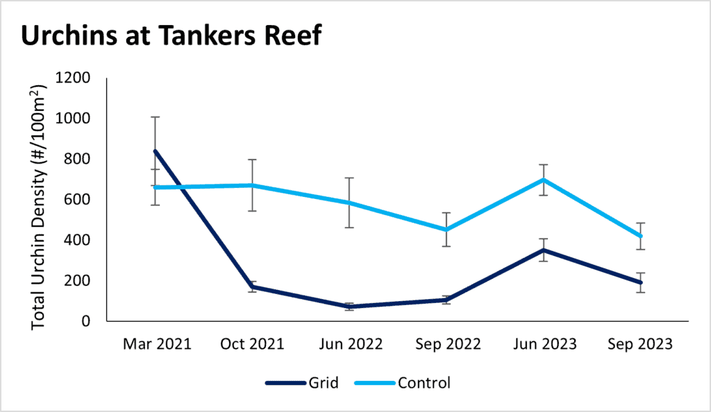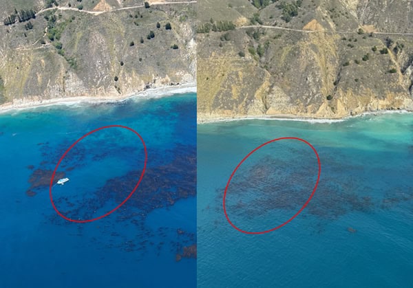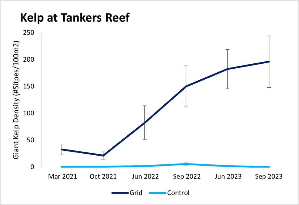 In 2022, Reef Check started a restoration site in Big Sur by partnering with commercial urchin divers to reduce urchin densities within a barren area approximately 2.5 acres in size. What is unique about this site is that it is surrounded by relatively healthy kelp forests on all sides. We believe that this will assist with a faster recovery of the kelp forest. In October 2022, approximately 6,000 lbs of urchins were removed from the site. In 2023, low urchin densities were maintained and kelp grew back. In 2024, Reef Check received a Scientific Collecting Permit (SCP) to cull urchins at the site and will continue work at this site with Reef Check volunteers. The lessons learned from this project will improve our understanding of how early intervention may be crucial to kelp restoration on the West Coast.