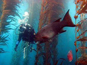 This or similar survey methods are used by many subtidal researchers working on temperate rocky reefs. Since fish move around and can swim in and out of the 2 x 2 meter box along the transect we use an approach that we call: stop, scan and search. To implement this method along the transect the fish-counting diver moves in stages. At the beginning of each stage the diver stops and scans the water ahead for mobile fish within an elongated imaginary box of 2 x 2 meters. During the scan all conspicuous individuals within the imaginary box in front of the diver are quickly counted. How far ahead the diver scans for fish depends on the visibility during the dive. Fish that move into the area after the scan are not considered and fish that leave the area after the scan are still recorded even if they are not present by the time the diver gets to writing down the data. This scan creates a snapshot of a section of the transect and only fish present during this snapshot are counted.