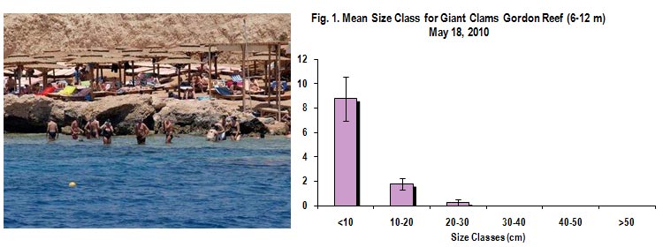 This area of the Red Sea has been high on the list of “must see” diving sites since the 1970s. At that time, Sharm was advertized with a “money-back” guarantee to see a shark on every dive. But the demographic has shifted from a few thousand highly trained scuba divers in those early years to over 3 million sun and fun snorkelers and inexperienced divers in 2009. Almost 400 dive boats carrying up to 60 passengers each target about 40 official dive sites. Over ten years ago, scientists familiar with the area predicted serious damage to the reefs as tourism ramped up. But based on the Reef Check surveys, other than sharks and most large predatory fish missing in action, the reefs are healthy. In fact, Sharm is one of the few places in the world where a Napoleon (Humphead) Wrasse – a key Reef Check indicator species – can be seen on almost every dive. The clear water, colorful corals and walls that drop down 100s of meters are sensational. Given the lack of predators, the populations of brilliant red-orange Anthias are probably the highest in the world. The low populations of large giant clams were a puzzle until a local biologist pointed out that they are a favored target of free diving Bedouin tribes who still live along the coast (Fig 1).