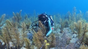 A team of 11 Reef Check EcoDivers, two scientific leaders from Corales de Paz and two dive leaders surveyed four of the most frequented dive sites on the island: Mantas, Tetes, Bajo de San Felipe and Loro Town. In general, the monitoring results show that the abundance of parrotfish (Scaridae) and surgeonfish (Acanthuridae) were similar at all sites; these are herbivorous fish that control macroalgae. The abundance of grunts or margates (Haemulidae) was also similar at all the monitored sites. There was a greater abundance of groupers (carnivorous fish of the Serranidae family) of more than 30 cm in length when compared to other sites monitored by the Reef Check Colombia program since 2017, such as San Andres Island and Santa Marta. Groupers are commercially important and show the wealth of usable resources still preserved for the people of the island.
