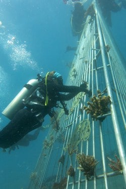 Expedition participants fixed fragments of damaged corals, previously collected from degraded areas of the reef, to the mail of this pyramid-shaped construction. The objective is to facilitate the regrowth and transformation over time into a real natural reef, a worthy conclusion of global involvement proceeding from knowledge through recovery of a species more and more vulnerable to extinction.