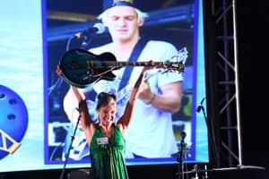 Reef Check Board Member Linden Wolbert shows off an electric guitar auctioned off during the evening’s live auction |