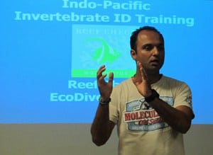 The course was conducted over two full days by two EcoDiver Trainers and Scuba Instructors from Dive Persia: Mohammad Hosseinpour (MSc. Ichthyology) and Nikoo Cheheltani (MSc. Marine Biology). The first day involved a classroom session which included an introduction to Reef Check, course presentations and an explanation of Reef Check methods. Even some non-divers participated in the classroom session to get familiar with the course. On the second day, which involved a practical session, diver participants were separated into four groups and asked to identify Reef Check target species and practice Reef Check methods underwater. The training went well and all student divers passed the tests.