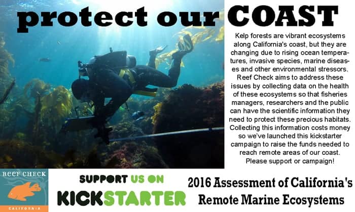 Reef Check is currently running a Kickstarter campaign to raise the funds needed to reach remote areas of the California coast for monitoring. Please consider donating to our 2016 Assessment of California’s Remote Marine Ecosystems.