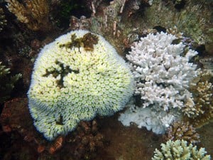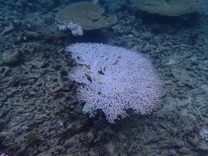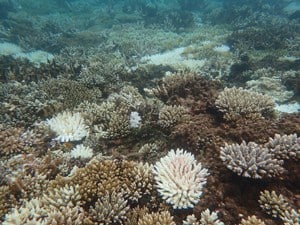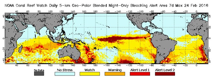 The 3rd Global Bleaching Event is now working its way through the southern hemisphere with NOAA Coral Reef Watch showing “hotspots” in the Central and SW Pacific and the Indian Ocean from Indonesia over to Madagascar. Significant bleaching has been recorded by Reef Check teams in many areas including Fiji and New Caledonia in the Pacific, and Mayotte in the Indian Ocean. Sadly, Fiji was just hit by perhaps the most powerful cyclone in history, killing dozens of people. The strong wind and waves mixed the waters there, rapidly reducing surface temperatures so that the bleaching and fish kills stopped.