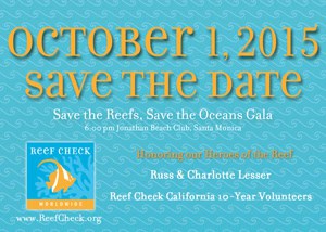Please join the Reef Check Foundation on Thursday, October 1st to celebrate the reefs and oceans! Reef Check’s 2015 Save the Reefs, Save the Oceans Gala will be on the beach at the Jonathan Beach Club in Santa Monica. The evening will feature fun music, unique auction items, delicious food, and an opportunity to meet our amazing honorees and some of the thousands of volunteer Reef Check EcoDivers who monitor Californian and tropical reefs as part of the Reef Check Foundation’s citizen scientist programs.