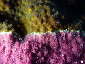 In the early-stage covering phase on live corals, a white rim is very evident at the interface with the sponge. These bands of bare coral clearly suggest the production of allelochemicals able to kill the coral tissue. The slimy mucus produced by the sponge could be involved in this kind of competitive interaction.
