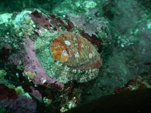 Several different types of shell-boring organisms also pose a threat to abalone. Piddock clams (Penitella conradi) are known to drill into the shell of the abalone. Date mussels (Lithophaga subula) and Cliona celata californiana, a boring sponge, secrete acid into small holes in the shell. Severe infections of boring organisms can inhibit abalone growth and cause the shells to deform. The abalone aquaculture industry has been battling the parasitic sabellid polychaete (Terebrasabella heterouncinata). The polychaete lives on the edge of the abalone shells and infestations can cause a disruption in normal shell growth and result in deformed, brittle shells. [DFW, 2005]