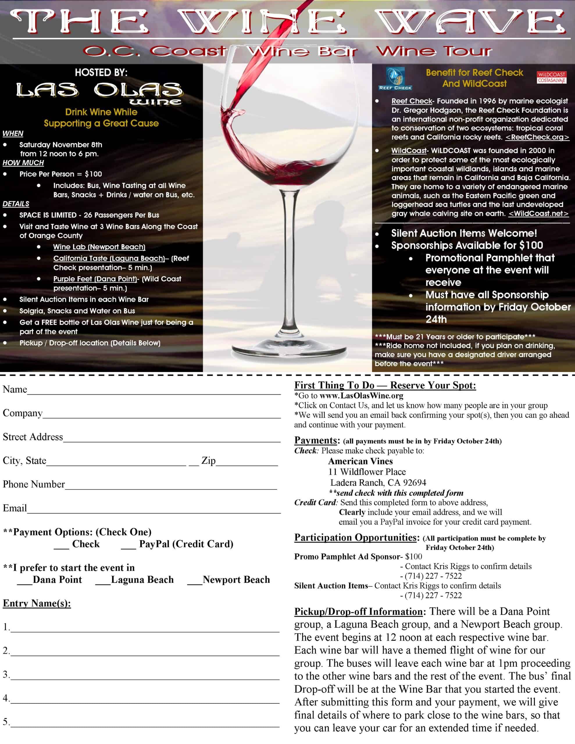Hey Southern Californians, do you have plans for Saturday, November 8th? Now you do! Reef Check is partnering with one of our sponsors, Las Olas Wine, for their 1st annual “Wine Wave” event. From 12pm-6pm, a coach bus will chauffeur you to three Orange County coast wine bars to taste wine, snack, socialize, and help raise money for Reef Check! You will have the opportunity to win great items in a silent auction and will receive a free bottle of Las Olas Wine to take home. Click here for more information and to download your registration form. Sign up soon because space is limited!