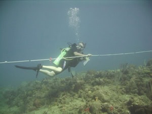 The model being tested includes a variety of teaching components, and features regular Reef Check survey work in Montserrat and Nevis, W.I. over the next three years. Included in the model is the idea that incorporating undergraduates in Reef Check surveys not only immerses them in a learning activity that is impossible to replicate in a classroom, but engages them on a scientific level where questions lead to hypothesis testing. In a recent example, two students participating in an invertebrate survey observed a patch of reef that appeared to contain an unusually high level of sponge diversity. This patch was located very near a sunken barge. The students questioned if the disturbance from the barge was related to their observation. This curiosity turned into an undergraduate research project that continues under the grant program.