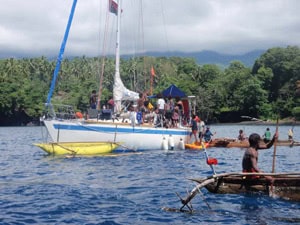 After the survey, canoes started visiting the boat. At one stage, Magic Roundabout had 14 canoes alongside with 26 visitors! On board, the team was very encouraged to hear that school children had collected 86 batteries off a local reef after the team had talked at the school earlier that day. During the school visit, the teachers shared their stories of what the reef was like 20 years ago and, as in every community the team visited, they told of how the fishing was getting harder every year.