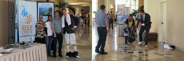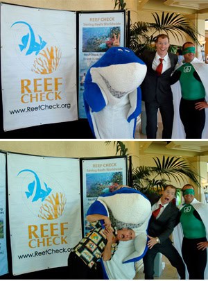 Such success may not have been possible without the participation of Benedikt Negro, Niki Konstantinou and Ryan Hartnett, who with a great sense of humor engaged the passer-bys. Benedikt, originally a mime artist in Berlin, has been performing in Cirque’s “O” Show for the past five years. Dressed in a grey suit, surf trunks and red tie, he graciously donated some of his precious time to “perform” underwater surveys at the Reef Check booth, with the help of his inseparable slippery fish, mask, snorkel and fins.