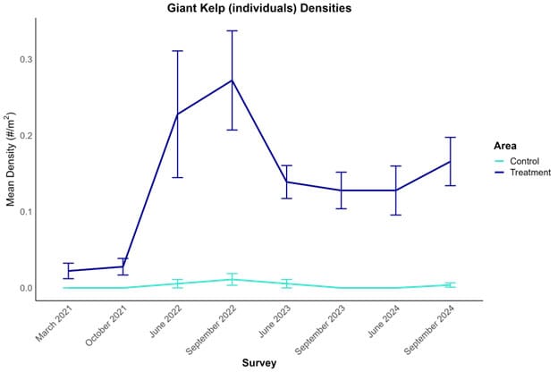 - Giant kelp densities have remained stable since the fall 2023 surveys.