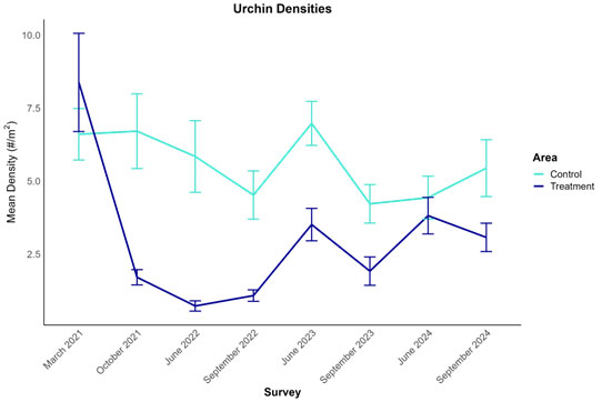 - Urchin densities at the restoration site currently average 3 urchins per m², compared to 5 urchins per m² at the control site.