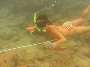 The group noted the high number of fishing nets caught on the reef and Angela, a TV reporter from Los Angeles, California, (click here to read Angela’s blog about the trip) removed some. On the other hand, the interns were excited to see large individuals of the Giant Clam – an important Reef Check indicator, harvested both for the decorative shells and for food. The size and number of giant clams that are now found on the reefs are partly the result of aquaculture, seeding and also good conservation practices in that area. Sadly, some of the dive operators in Phuket complained of an increasing level of poaching at more remote sites further offshore. Reef Check has been lucky over the years to have the support of Thai marine biologists, such as Dr. Suchana Chavanich of Chulalongkorn University, who are working hard not only to carry out intensive scientific research on reefs, but also to spread the word about the importance of coral reef conservation to the Thai public through books and the media.