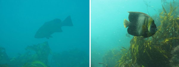 The Isla Magdalena Cooperative had heard of COBI and RC’s work with the Coop on Isla Natividad and invited us to come start a similar marine reserve project in their fishing grounds. Unlike the Natividad Coop that have exclusive rights to the area around their island, the situation is much more complex in Bahía Magdalena with literally tens of different Coops with fishing concessions in overlapping areas. However, COBI successfully negotiated a new marine reserve that was unanimously approved by the Coop in June as well as securing funds for the purchase of a vessel to help with enforcement of the new reserve. The goal of our trip was to continue to develop a relationship with the community and make dives to determine the species assemblages and adjust the monitoring protocol accordingly. We found a system dominated by tropical species such angelfish and butterflyfish swimming among a sub-canopy of often dense Southern sea palm (Eisenia arborea). We also were lucky enough to see several Gulf grouper (Mycteroperca jordani).