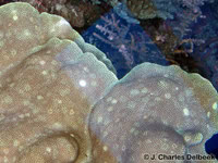 At that time, we preferred the explanation of an anomaly of Millepora. I observed in my aquarium that Millepora often forms “tissue bubbles” at branches as well as “bleached” small areas; but not such perfectly round patches.