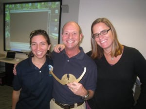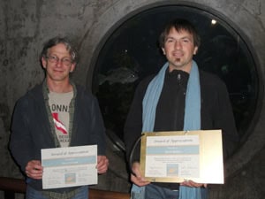 We had great end of the year parties in early December at the Long Beach Aquarium and the Monterey Bay Aquarium, where we had the opportunities to thank many of our volunteers for all they do for the organization. A good time was had by all as we were guided behind the scenes by aquarium staff, had a relaxing lunch, and viewed slide shows of photos and accomplishments of 2009. We’ve had spectacular participation by so many volunteers this year and we wanted to honor a few that went above and beyond the call of duty in 2009 with awards, broken up by geographic region. In the Southern California program, the Golden Calipers Award went to Dirk Burcham who surveyed 154 transects in 2009 (he also won the Golden Slate Award last year)! Wow! The Silver Slate Award went to Yasumichi Kato who surveyed 85 transects! Sheree Lahey won a special Data Captain Award for entering a huge amount of this season’s data into our Nearshore Ecosystem Database (we love our data entry volunteers!). In the North/Central California region the Golden Slate Award went to Jonah Mulski who surveyed 52 transects! David Horwich won a special Survey Captain Award for taking great initiative and organizing 3 surveys on his own. Congratulations winning Reef Checkers! Big thanks to the aquariums for hosting us!