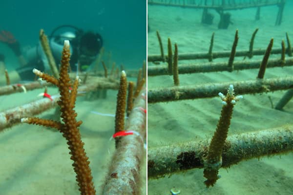 RCM’s rehabilitation method involves collecting coral fragments from donor sites and “planting” them in a nursery to allow them to stabilize and grow before finally transplanting them to a permanent site. The key here is to actively maintain the nurseries while the coral transplants are stabilizing, keeping them free of silt and algae. This reduces the mortality rate, resulting in more effective rehabilitation. RCM’s rehabilitation methodology is designed to be low cost, so that it is easy for dive operators and community members to take part.