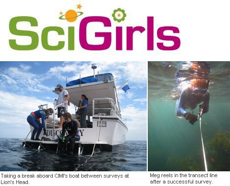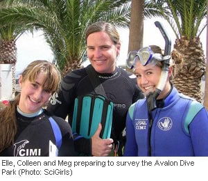 During August 2009, Reef Check (RC) was invited to be part of a groundbreaking new series on PBS called SciGirls. In this series, viewers follow teams of middle school girls and their mentors as they create their own inquiry-based investigations of the environment, technology, engineering, animal behavior and health. I was asked to be the mentor to two 13 & 14 year old sisters from Southern California named Meg and Elle, who are both snorkelers and scuba divers and have extensive experience on our local rocky reefs. The location for the shoot was Catalina Island Marine Institute at Toyon Bay (CIMI) as well as other dive sites on the island. CIMI hosted the girls and the film crew, and we spent three days exploring their laboratories and snorkeling and diving at various locations around the island, collecting data inside and outside a marine reserve. We developed a modified RC California protocol to allow the girls to collect data while snorkeling from the surface. Our focus was on 7 total indicator species instead of our usual 73 and the girls discovered that changes in the populations of indicator species are interconnected through predator/prey relationships on the reefs.