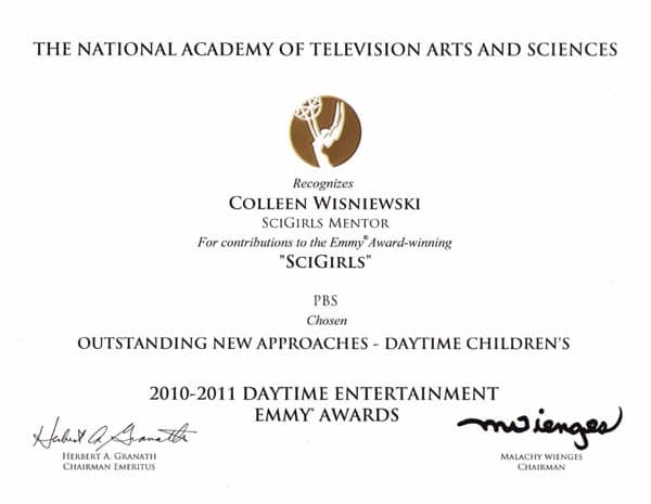 Our Emmy Award is in the \”New Approaches Daytime Children's” category and was noted for its unique merging of television and the web. Episodes of SciGirls are still being broadcast on PBS stations around the United States. In addition, our episode (number 109: Ocean Ecosystems) is also available online at the SciGirls website in case you haven't gotten a chance to see it. I recently received an official Emmy Award certificate from the National Academy of Arts and Sciences and it's very exciting, but I'm still holding out for a golden mini-Emmy statuette for my desk!