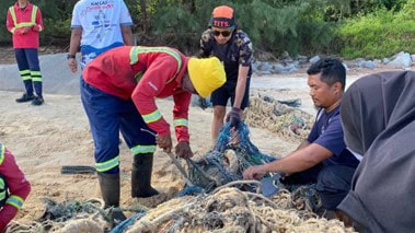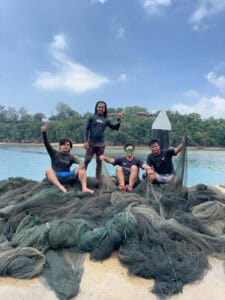 There has been limited data on ghost nets in Malaysia, specifically from Tioman Island. RCM began training the local Tioman islanders in 2015 to locate and remove ghost nets from any reefs and beaches around the island. We also helped set up a reporting hotline to gather information about ghost nets. From 2016 until 2022, we recorded a retrieval of 145 ghost nets, weighing more than 21 tonnes (21,000 kg) from around Tioman Island alone. Today, most of the retrieval work on the island is done by the Tioman Marine Conservation Group (TMCG), with the help of volunteers from local dive shops.