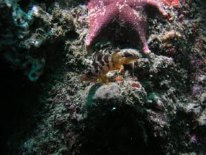 On our surveys, we have seen many young rockfish recruits settling onto the rocky reefs this year. These fish, born as tiny larvae, spend several weeks to a month in the open ocean environment where they grow to fully formed fish before coming back to the reefs to settle and grow up to become adult fish. The numbers of young arriving at a given reef varies greatly among years and it looks like this will be a great year for their recruitment with large numbers of young arriving. As the survey season progresses we will be able to see if this trend continues and document it in our data. We have not only seen many tiny fish on the reefs but also have gotten many reports of exciting sightings above the water. Our volunteers have seen large numbers of whales and dolphins near our sites or on the boat trips to and from the surveys. Especially in the Monterey Bay region an exceptional number of blue and humpback whales have been seen. These are always great moments when the boat captain announces a whale sighting and slows the boat. Many times we are able to watch them as they pass by the boat until they dive again to feed on the abundant krill in the bay.