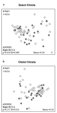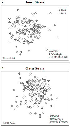 For both invertebrate and fish data, the community composition as well as species diversity and richness were compared. Despite the differences in the habitat, both programs reported relatively similar benthic invertebrate communities. In a multivariate analysis (ANOSIM) that compares the invertebrate communities no significant differences between the programs were detected (Figure 1). The graphical comparison of the fish community data from both groups showed even less differences than the invertebrate data. Fish data from both programs are well interspersed demonstrating similarities between the programs (Figure 2). In this case the statistical test (ANOSIM) shows some differences between the fish communities but with little support (i.e. low R values and high stress values in MDS plots).