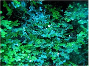 Many species of calcareous algae take up calcium from seawater and create a calcium carbonate skeleton that can be either a tightly encrusting red or pink layer on rocks such as Lithophyllum, loosely encrusting or can form various branching structures such as the ubiquitous green Halimeda. There are over a hundred species of Lithophyllum and almost 40 species of Halimeda found in all tropical waters. There is only one brown genus, Padina. Halimeda “branches” serve as food for herbivores and after death, their broken segments make up as much as 90% of sand on some beaches and they create the bulk “in fill” of many fossil reefs. Coralline red algae also provide much of the “cement” that holds a reef together even after they have died.