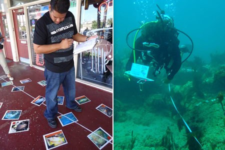 The training started with a classroom session at Force-E Dive Centers in Pompano Beach, Florida. As part of the class they practiced a dry land survey where pictures of reef fish, invertebrates and impacts are placed along a transect line. This is a great way to practice before jumping in the water where communication is a bit more challenging.
