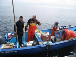 En ruta a la isla buceamos en las Islas San Benito, al norte de Isla Natividad. En la tarde hicimos algunas presentaciones sobre el trabajo de la Cooperativa, e incluimos diapositivas sobre algunas de las especies que encontraríamos durante nuestros buceos. Finalmente llegamos a Natividad donde pasamos tres días explorando sitios extraordinarios de buceo, dentro y fuera de las reservas marinas. Tal y como recordaba, los arrecifes rocosos son estupendos, y en nuestro primer buceo vimos un mola-mola, o pez sol, en el agua cristalina del bosque de sargazo; también vimos mero negro y medusas yema-de-huevo. ¡Qué bienvenida tan maravillosa a Isla Natividad! También bajamos a tierra y visitamos el laboratorio donde la Cooperativa esta criando abulón para repoblar los sitios pesqueros, vimos la planta desalinadora y el bello faro, y comimos un manjar de pescado fresco local antes de regresar al barco. Creo que los pasajeros disfrutaron grandemente la experiencia arriba y debajo de las aguas que rodean la isla. Esta expedición fue un proyecto piloto y esperamos que se lleven a cabo otras expediciones a la isla.