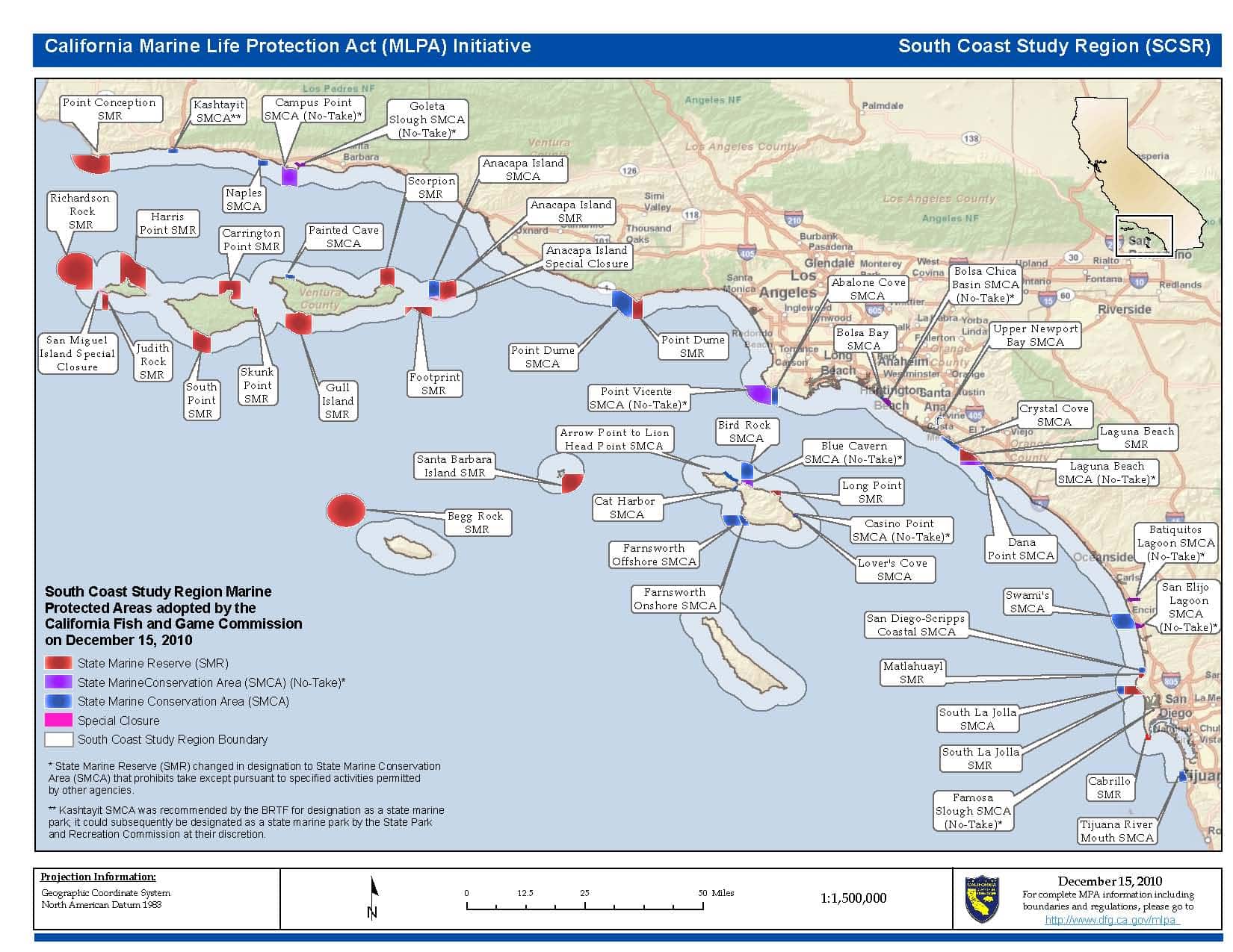 The south coast study region is the third of five in the process of establishing a network of MPAs along the entire coast of California as mandated by the Marine Life Protection Act (MLPA). Having one of the most highly valued coastlines worldwide, the public input and involvement by different interest groups in this region was intense, with over 12,000 written comments submitted in the 2-year review process which included more than 50 days available for public comment. Protection along this coastline will enhance the many recreational opportunities, such as SCUBA diving, surfing, kayaking and fishing, that the ocean provides for millions of people living in southern California. In addition, it is hoped that these reserves will help keep the ocean healthy for future generations to enjoy such activities.