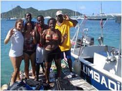 Following an initial classroom session, participants were given a practical introduction to the RC methodology in a shallow area of the Sandy Island Oyster Bed MPA. They tried their hand at placing the transect line, recording substrate cover, and counting indicator organisms while snorkelling. On the last two days of the course, participants collected data in deeper areas of the MPA using SCUBA. Following a delicious meal of saltfish souse on the final day, participants successfully completed the required test and became certified Reef Check EcoDivers! This training will assist the MPA managers involved in implementing a standardized protocol to regularly monitor the effects of stressors such as tourism, climate change, and coastal development on the coral reefs of the Grenadines. Additional support for the implementation of reef monitoring is being provided through a year-long small grant program for each of the participating MPAs, which is also being delivered by SusGren and funded through NFWF.