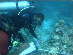 Reef Check EcoDiver Trainer Olando Harvey, marine biologist for the Tobago Cays Marine Park, was assisted by ranger Benjamin Wilson in delivering the course to participants over a 4-day period from February 8-11, 2011. Three wardens from the Moliniere-Beausejour MPA (Ann-Marie Taitt, Cecil McQueen, and Coddington Jeffrey) travelled from mainland Grenada to join their counterparts from the Sandy Island Oyster Bed MPA on Carriacou (wardens Bryan Prince, Kordel Simon, and Jody Placid, along with board chair Davon Baker) in taking the course. SusGren staff Molly Brewis and Valerie Francella were also on hand to help with course organisation and participate in the training sessions.