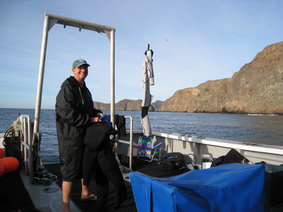 Dirk was always up for a challenge or to try something new. He participated in the first Reef Check expedition to Isla Natividad. Reef Check teamed up with two other organizations, the fishing Cooperativa Buzos y Pescadores and the Mexico based environmental group Comunidad y Biodiversidad (COBI), to run the first recreational dive trip to Isla Natividad in the fall of 2009. This small Pacific island located on the west coast of northern Baja California Sur, Mexico, is part of the Vizcaino Biosphere Reserve. The trip was part of a project to use non-fishing activities to earn income for the fishing Cooperativa and pay part of the cost of operating the two marine reserves. While this island is beautiful with amazing diving in thick kelp forests, the area was not really set up for typical dive expeditions for tourists, but Dirk was up for the adventure.