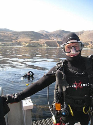 In 2009, I had the unique opportunity to work with the Port of Los Angeles Police Dive team to train them to perform Reef Check surveys. I needed someone with a flexible schedule to assist me and Dirk jumped at the opportunity. After a few weeks of training the team, we finally got to perform our first survey in Los Angeles harbor at a site surrounded by cranes and trucks and lined by giant chunks of quarry rock. I wasn’t expecting much in the way of clear water or marine life – honestly, I was preparing for some very unpleasant diving conditions, but I knew that Dirk was my trusty dive buddy and that we could handle it. We were met with 25-foot visibility (if you didn’t stir up the very fine sediment on the bottom) and loads of invertebrates and fish. Of course, it was a bit different from our usual sites in that there was a fair bit of noise underwater any time a tugboat or a container ship passed by. But it was very interesting to get a glimpse at what goes on underwater in the port and to experience it with Dirk.