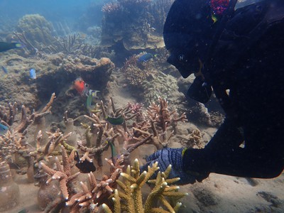 The coral rehabilitation work is still ongoing at all of our bases and coral monitoring in Tioman Island has shown that the coral fragments are growing well.