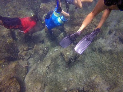 Our classroom was set up at NASC, outside underneath a shade while the in-water sessions were done at the breakwater in front of the Four Seasons Resort. St. Kitts and Nevis does not have much direct reef access from the shore, but the breakwater did give us a good location to use for Reef Check. Easy access, shallow for snorkeling and a lot of marine life, including frogfish, stingray, spotted eagle ray, green turtle, barracuda, butterflyfish, grunts, parrotfish, porcupine fish, lobster, flounders, damselfish, and Acropora palmata, Millepora, Pseudodiploria and Porites species of coral.