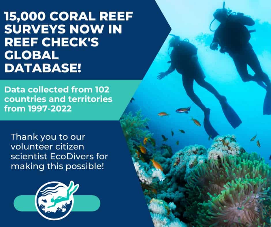 Reef Check has reached a significant milestone! Thanks to 25 years of hard work from our volunteer EcoDivers we now have more than 15,000 coral reef surveys in our global database! The data are analyzed and used locally by marine park managers, nationally by fisheries and environment managers, and internationally by organizations, including United Nations agencies, to help better track and care for coral reefs.