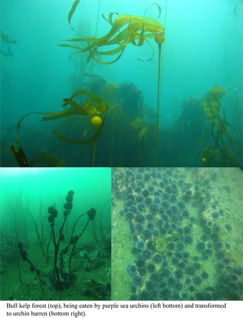 Since 2014, bull kelp in northern California, primarily along the Sonoma and Mendocino county coastline, has declined more than 90% due to a combination of extreme warm water events and multiple ecological stressors, including significant increases in purple sea urchin populations. This has led to a large-scale shift from bull kelp forests to urchin barrens across most of the region. This shift has caused significant losses of kelp forest biodiversity and ecosystem services, resulting in the closure of the recreational red abalone fishery (estimated at $44 Million non-market value) in 2018 and the collapse of the North Coast commercial red urchin fishery ($3 Million ex-vessel value) beginning in 2015.
