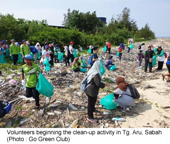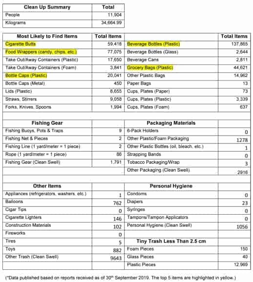 The clean-up was conducted at more than 100 locations around Malaysia. Almost 37,000 kg of trash were removed from beaches, with the most common items being plastic beverage bottles, food wrappers and cigarette butts. Plastic grocery bags were also listed in the top five most common items found, besides plastic bottle caps. Some organizers have not recorded the number of individual items, as some locations had a lot of trash and it was very difficult to count them. These volunteers had to shovel the trash along the beach into bags instead of picking them up one by one. They reported a net close to 200kg and more than 1500 polystyrene chips. The amount of trash collected in this location filled a 3-ton skip.