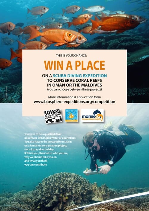 Biosphere Expeditions, in partnership with the Marine Conservation Society (MCS) and the Reef Check Foundation, is offering a free place on a citizen science reef conservation expedition. The winner of this unique competition opportunity can choose from either a project to Musandam (Oman) or the Maldives and must be qualified to a minimum PADI Open Water or equivalent.