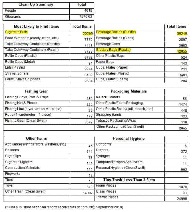 In previous years, Reef Check Malaysia conducted clean-ups in conjunction with International Coastal Clean-up on Tioman and Mantanani Islands, but on a much smaller scale than this year. In conjunction with the 3rd International Year of the Reef 2018, Reef Check Malaysia planned for a clean- up on a much wider scale. Reef Check Malaysia’s Theresa Ng, who coordinated the event, commented: “The Body Shop is the custodian for International Coastal Clean-up in Malaysia, and we approached them to offer our help to arrange a national-scale event to coincide with the International Year of the Reef and to gather data for our campaign to reduce marine debris. Teams were self-organizing and we provided briefing materials on how to conduct clean-ups and collect data. The effort has been tremendous, and we would like to thank the thousands of people who have taken part.”