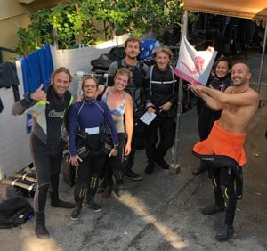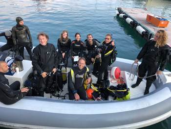 | Dr. Carlo Cerrano (in dry suit on left), and Eliana Ferretti (sitting on the left) led the RC Med survey for workshop participants |