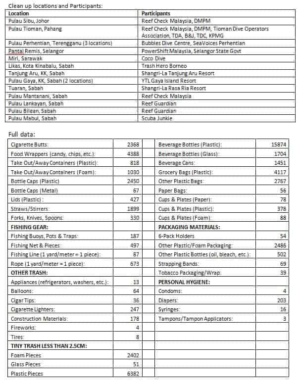 Julian Hyde, General Manager of clean-up organizer Reef Check Malaysia (RCM), said: “We have been concerned about marine debris for some time. This clean-up shows just how big the problem is. Imagine if this were extrapolated to the whole of Malaysia.”